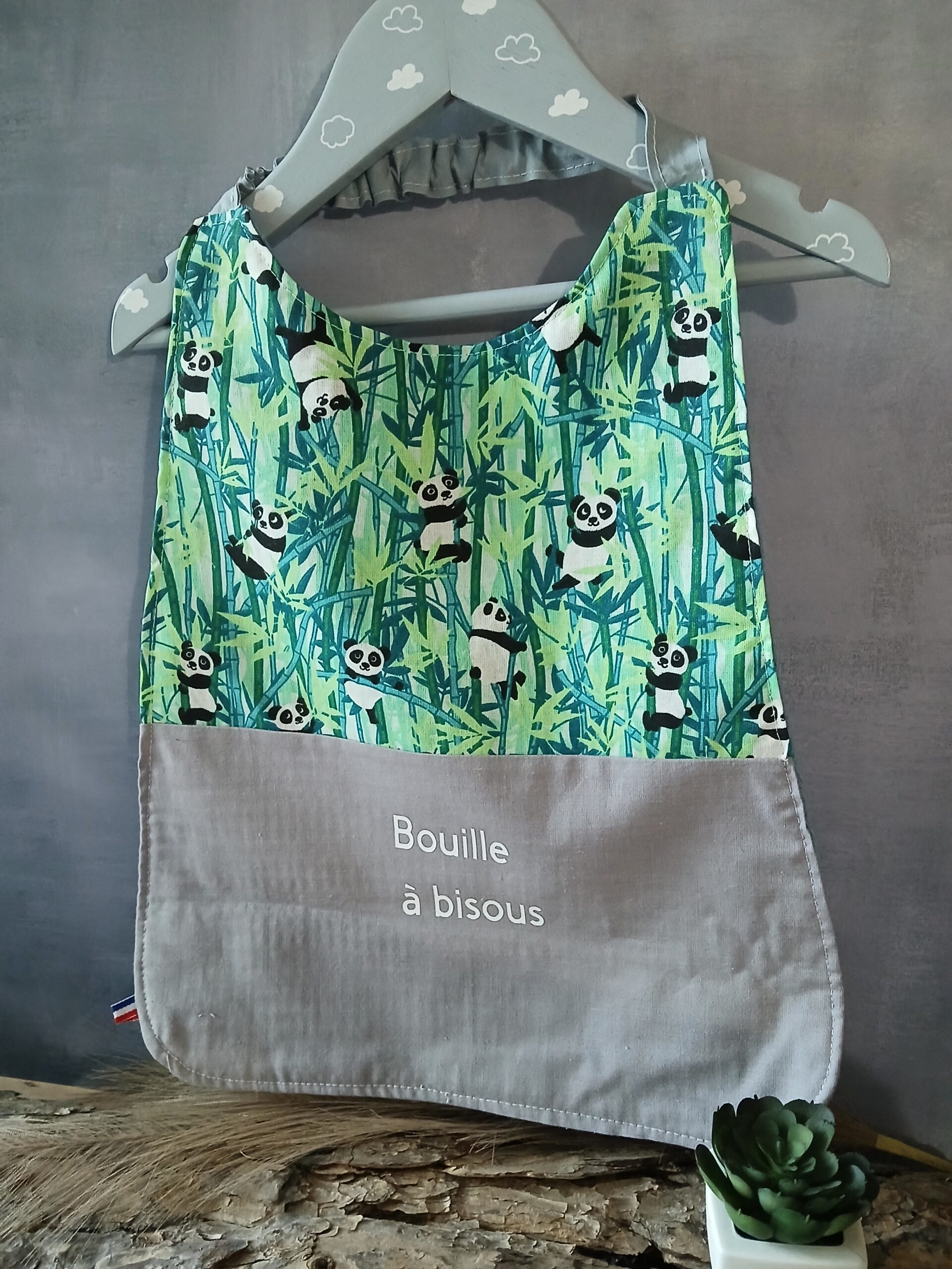Grand bavoir motif pandas à inscription personnalisée « bouille à bisous » / nid d’abeille bleu