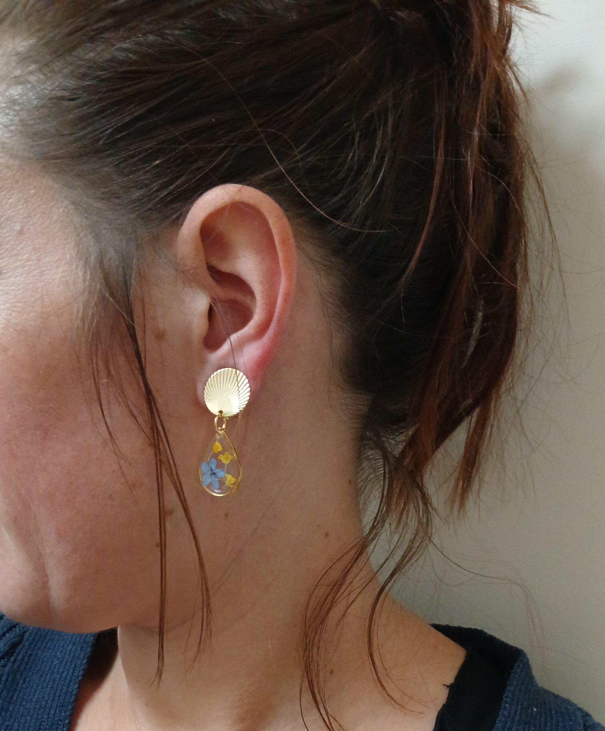 Matériaux : Résine UV, fleurs séchées naturelles, apprêts en acier inoxydable, système de clips pour oreilles non percées
