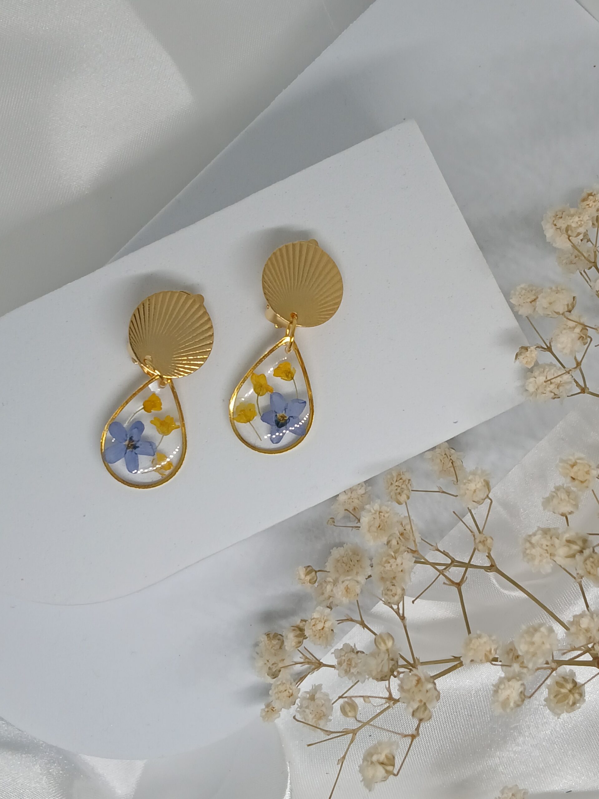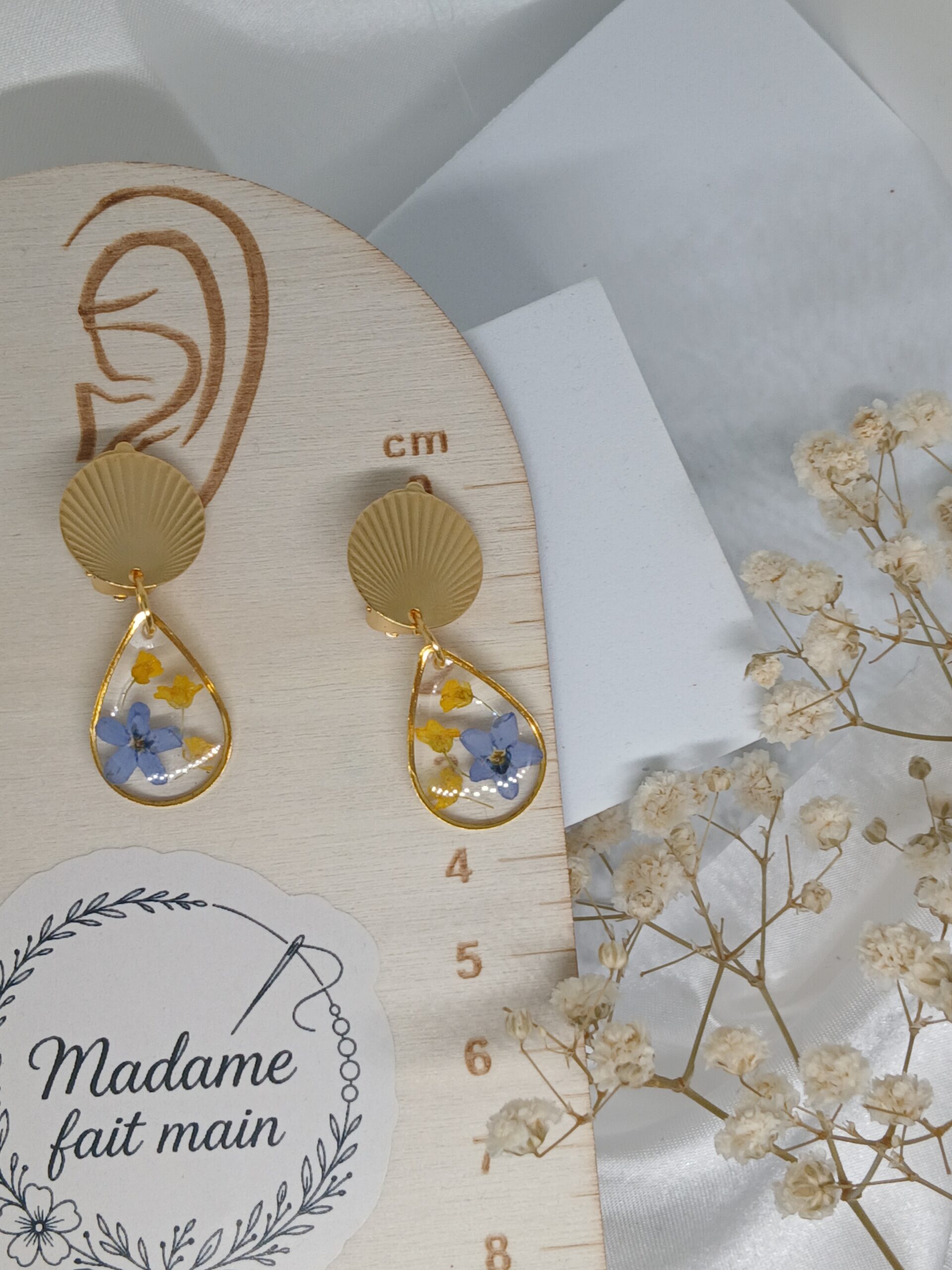 Chaque paire capture la délicatesse de fleurs séchées naturelles, soigneusement incluses dans de la résine UV transparente, pour créer un bijou léger, lumineux et absolument unique.