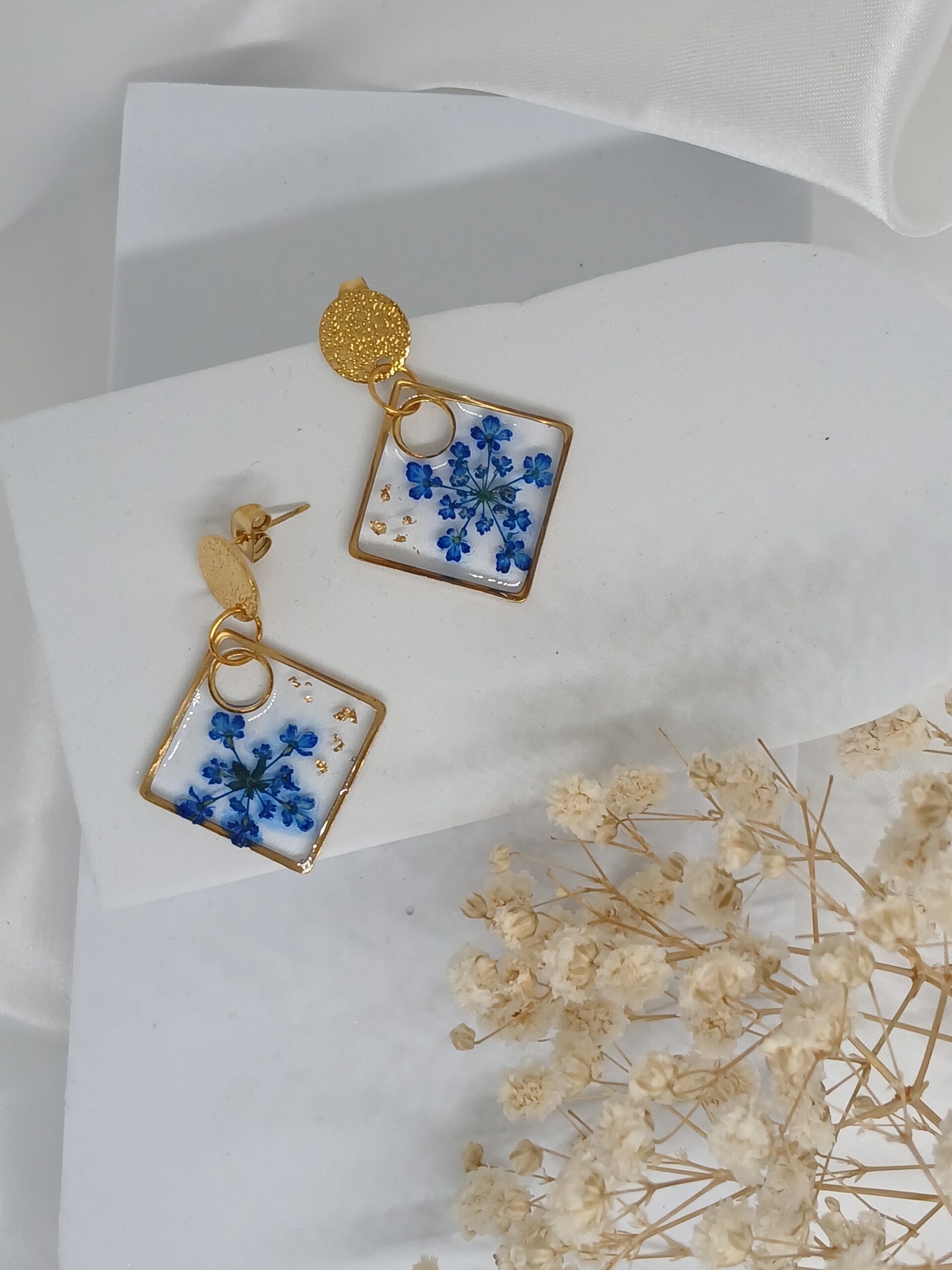 Boucles d’oreilles fleurs de carotte sauvage teintées bleues, forme carrée. Le bleu a légèrement diffusé dans la résine.