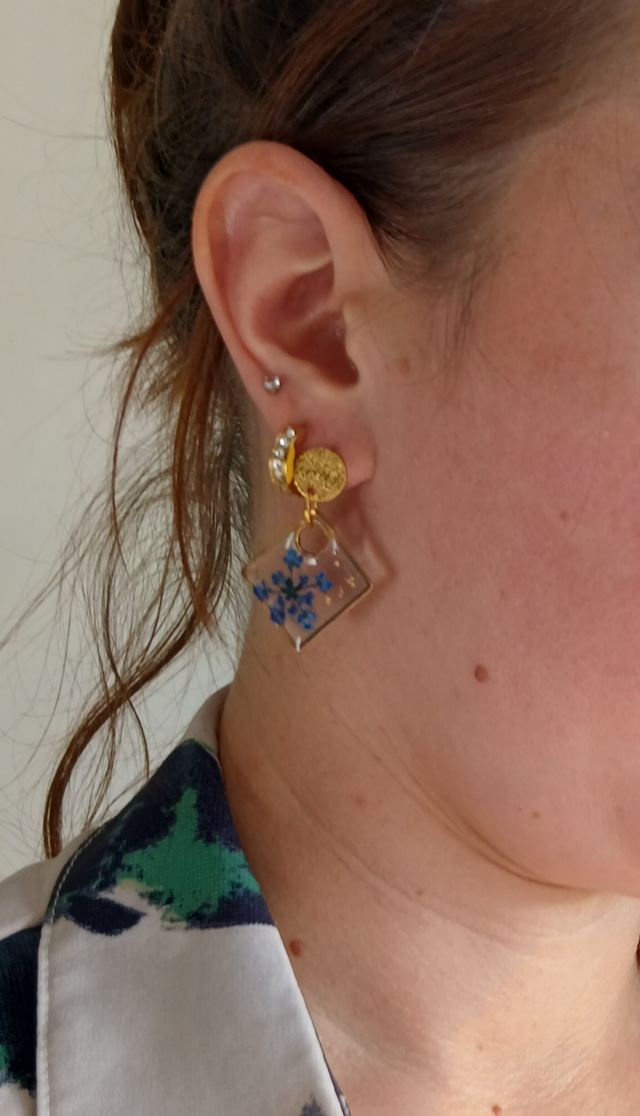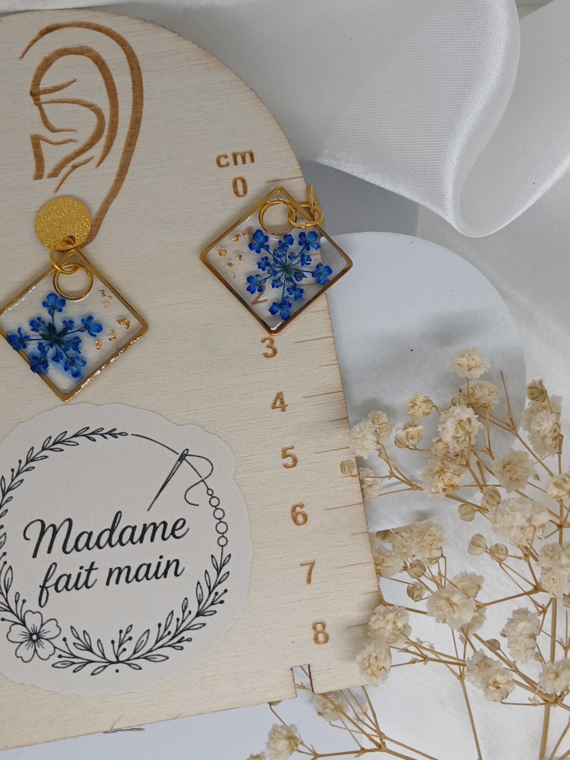 Chaque paire capture la délicatesse de fleurs séchées naturelles, soigneusement incluses dans de la résine UV transparente, pour créer un bijou léger, lumineux et absolument unique.