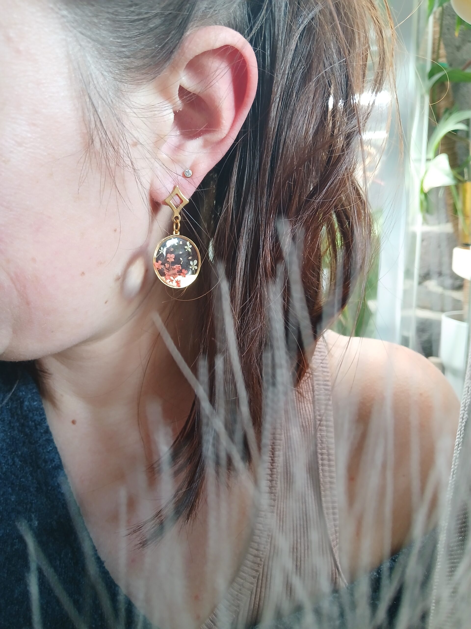 Chaque paire capture la délicatesse de fleurs séchées naturelles, soigneusement incluses dans de la résine UV transparente, pour créer un bijou léger, lumineux et absolument unique.