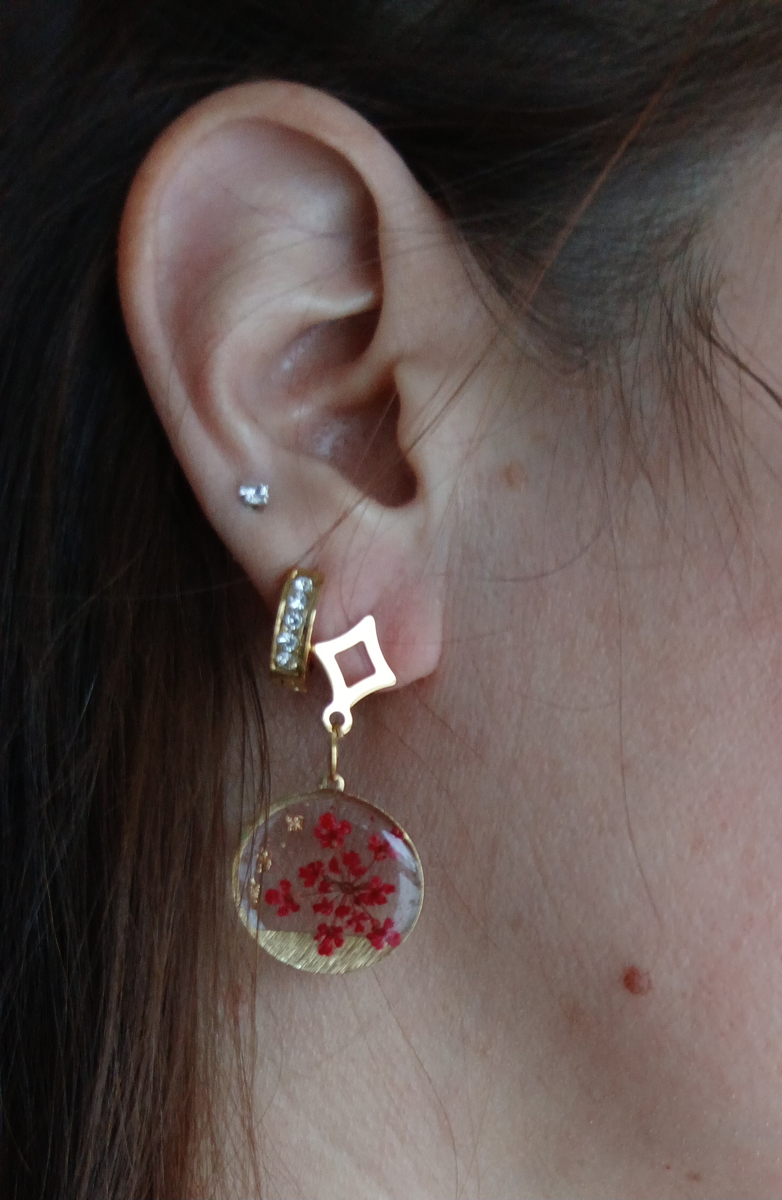 Chaque paire capture la délicatesse de fleurs séchées naturelles, soigneusement incluses dans de la résine UV transparente, pour créer un bijou léger, lumineux et absolument unique.