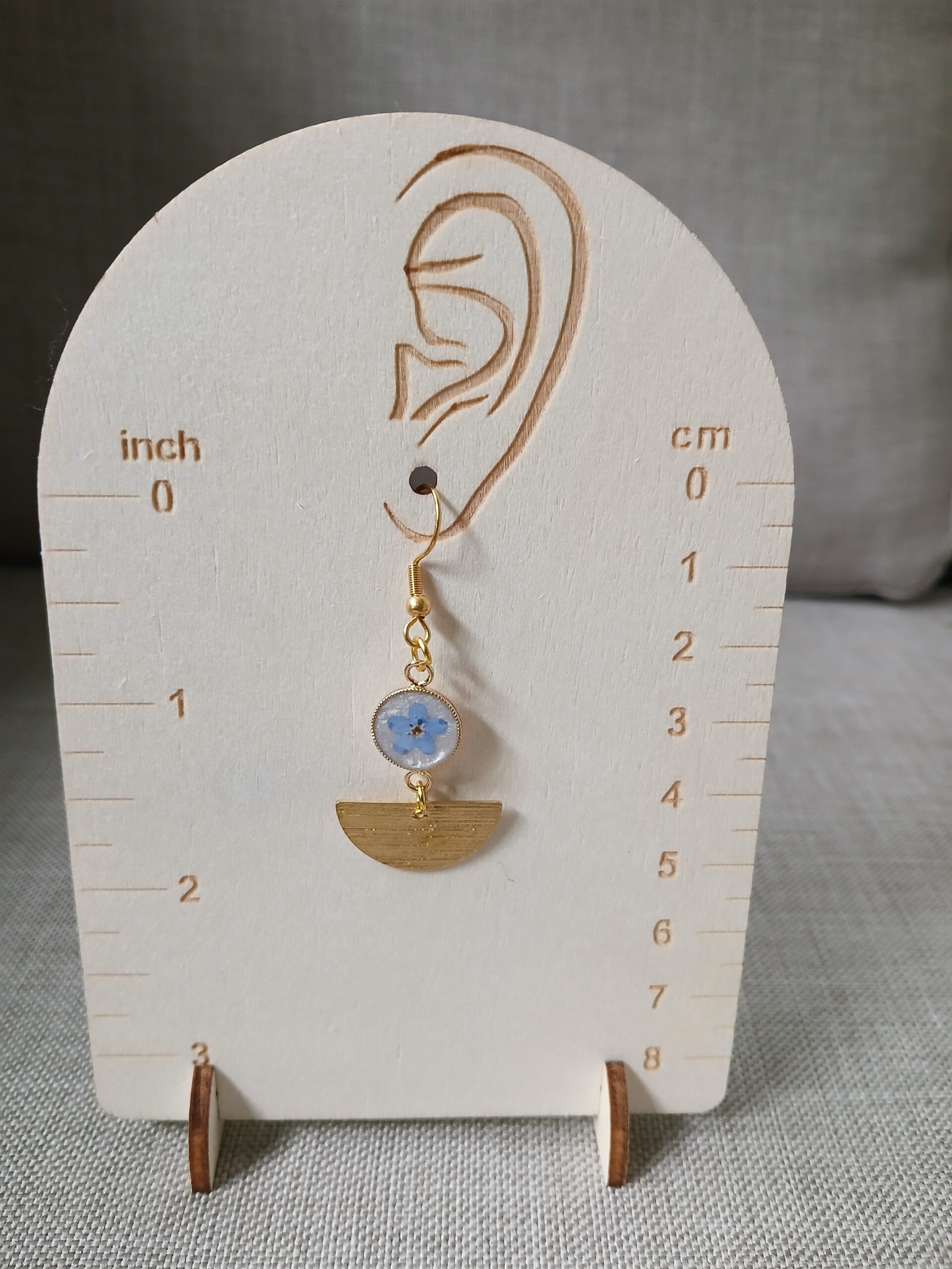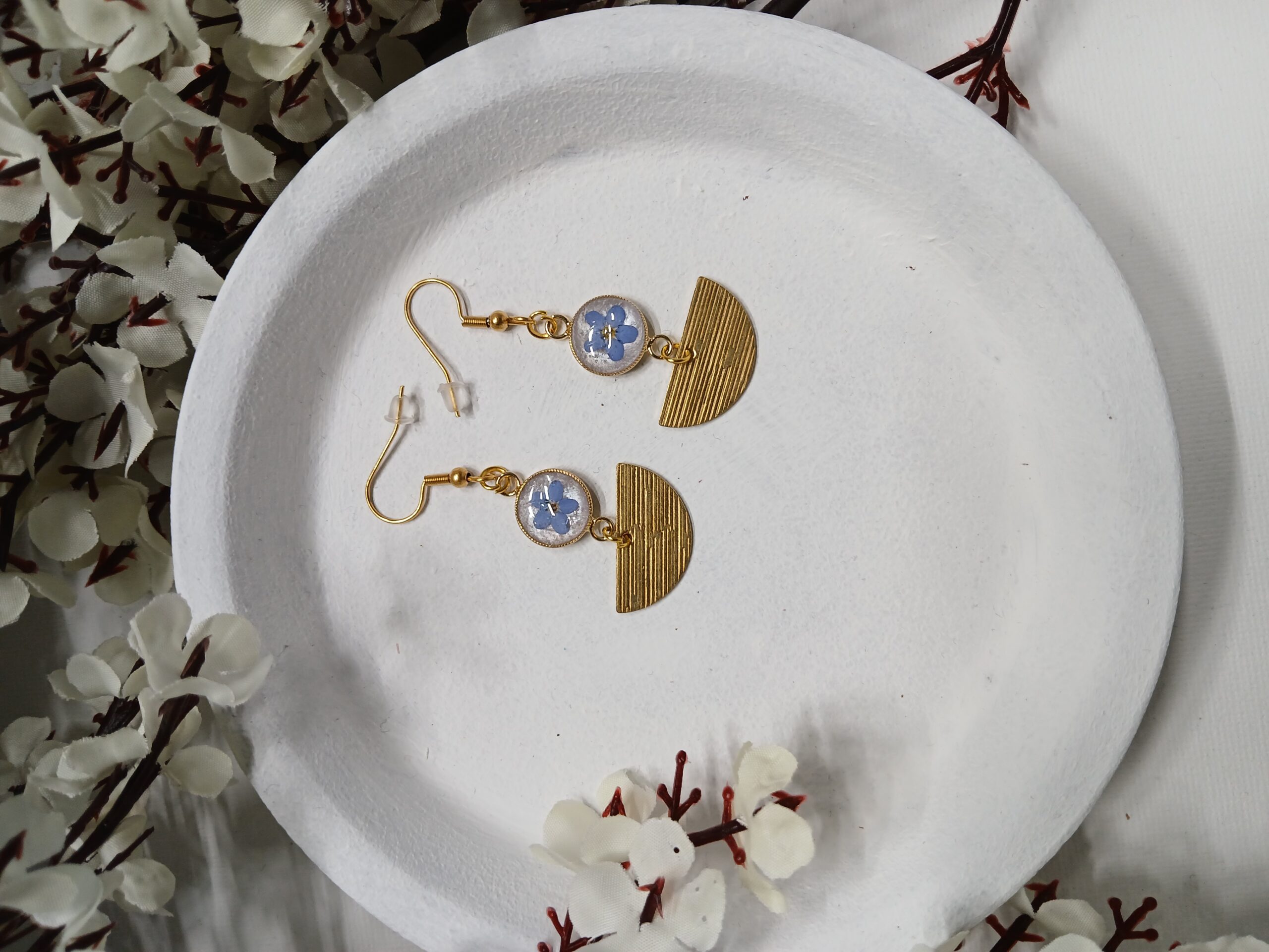 Boucles d’oreilles fleurs de myosotis, longues et pendantes. Breloque demi-cercle en laiton.