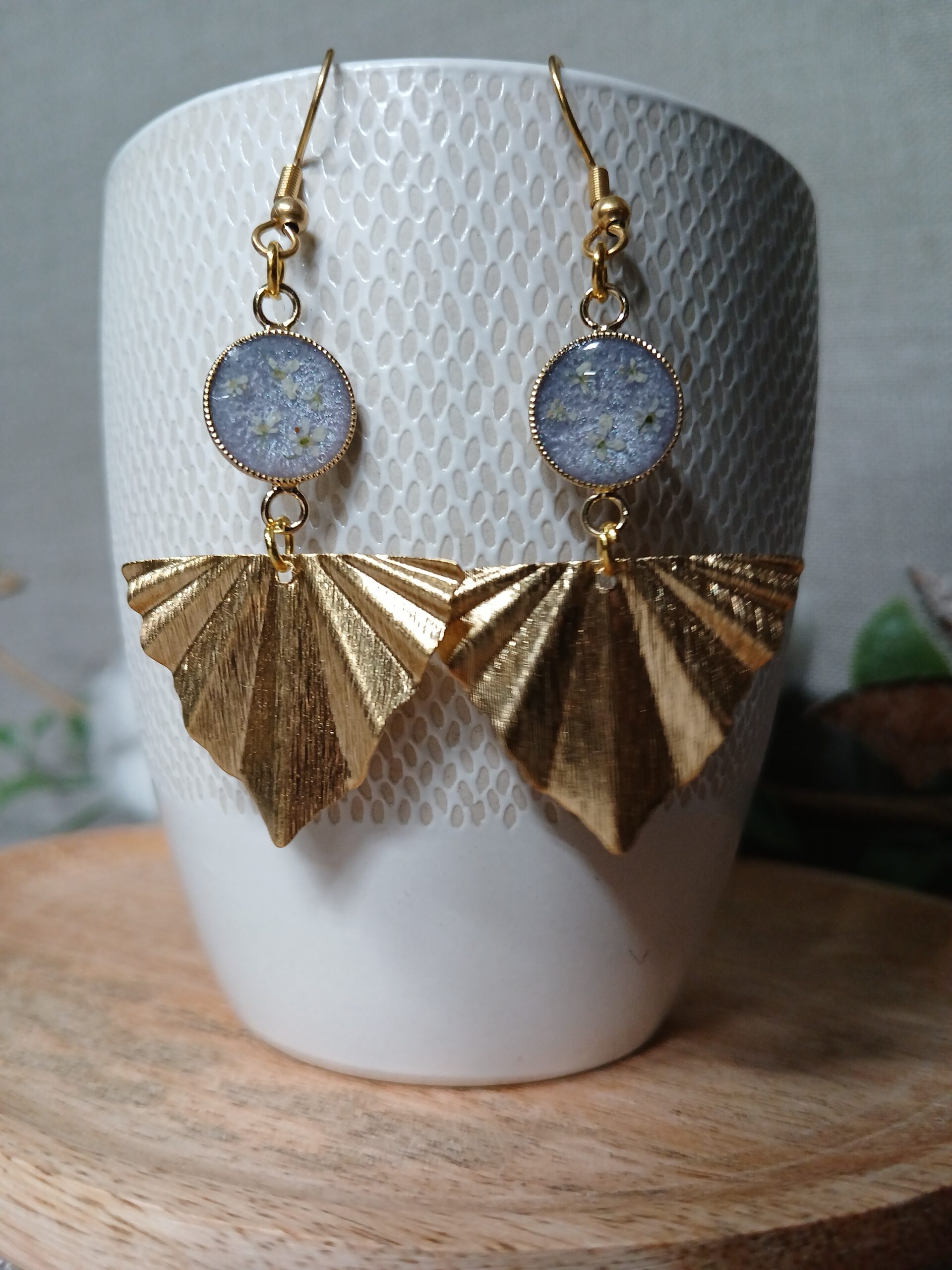 Boucles d’oreilles fleurs de carotte sauvage, fond bleu gris, longues et pendantes. Breloque triangle en laiton.