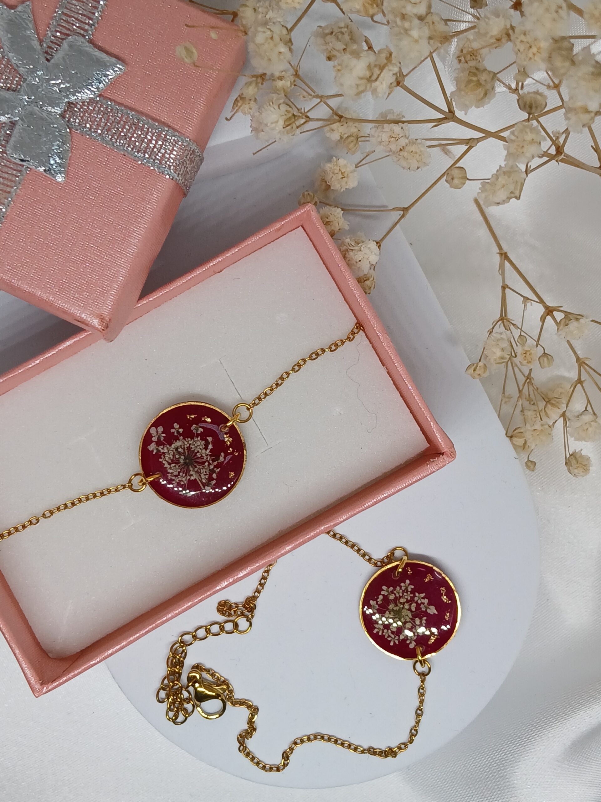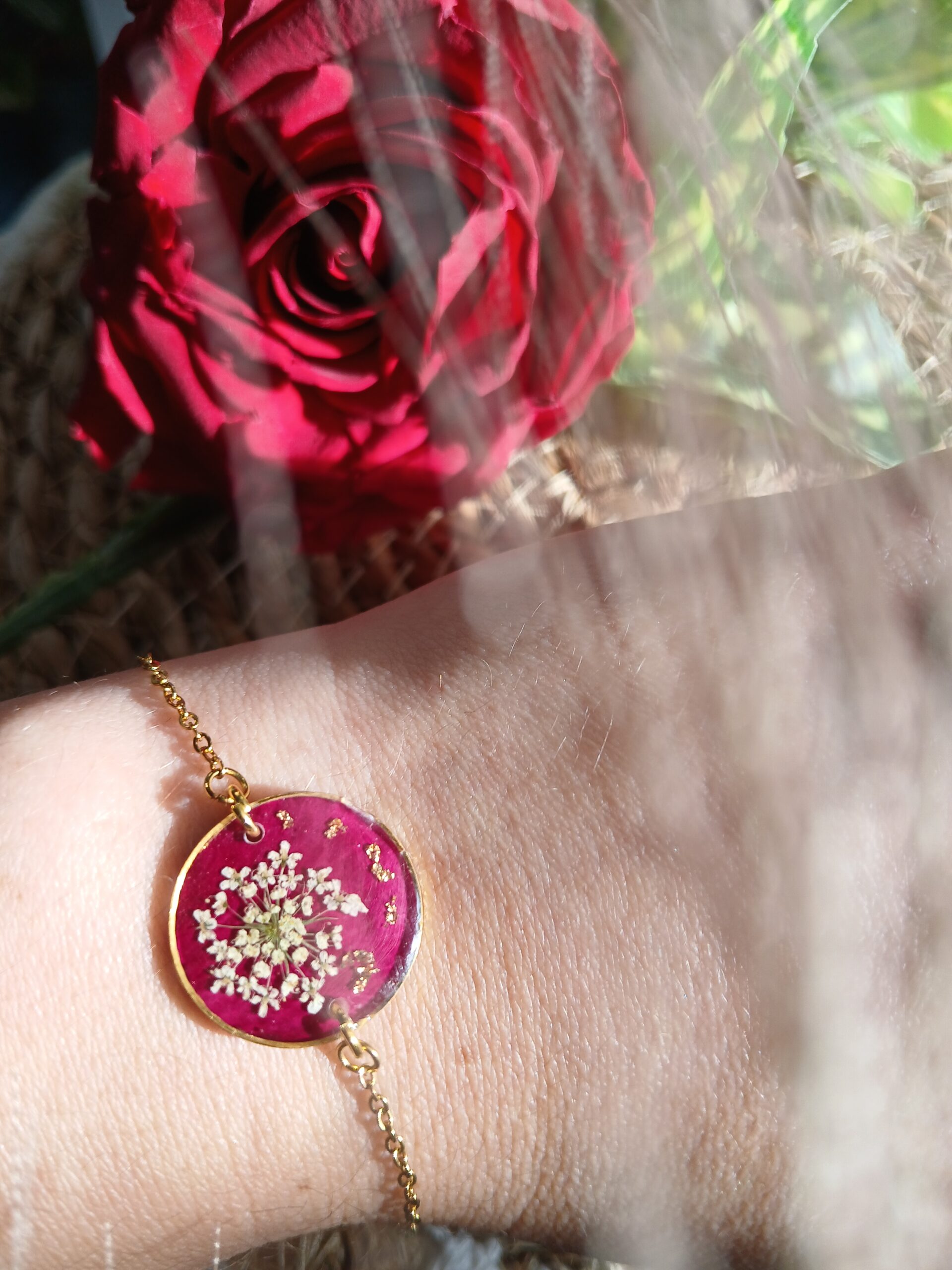 Offrez des fleurs autrement. Découvrez ce magnifique bracelet sur fond de rose rouge et de fleur de carotte sauvage. Laissez-vous séduire par l’élégance naturelle de ce bracelet fait main, alliant la finesse de l’acier inoxydable à la beauté délicate de fleurs séchées incluses dans de la résine. Chaque pièce est une création unique, comme un petit jardin éternel à porter au poignet.