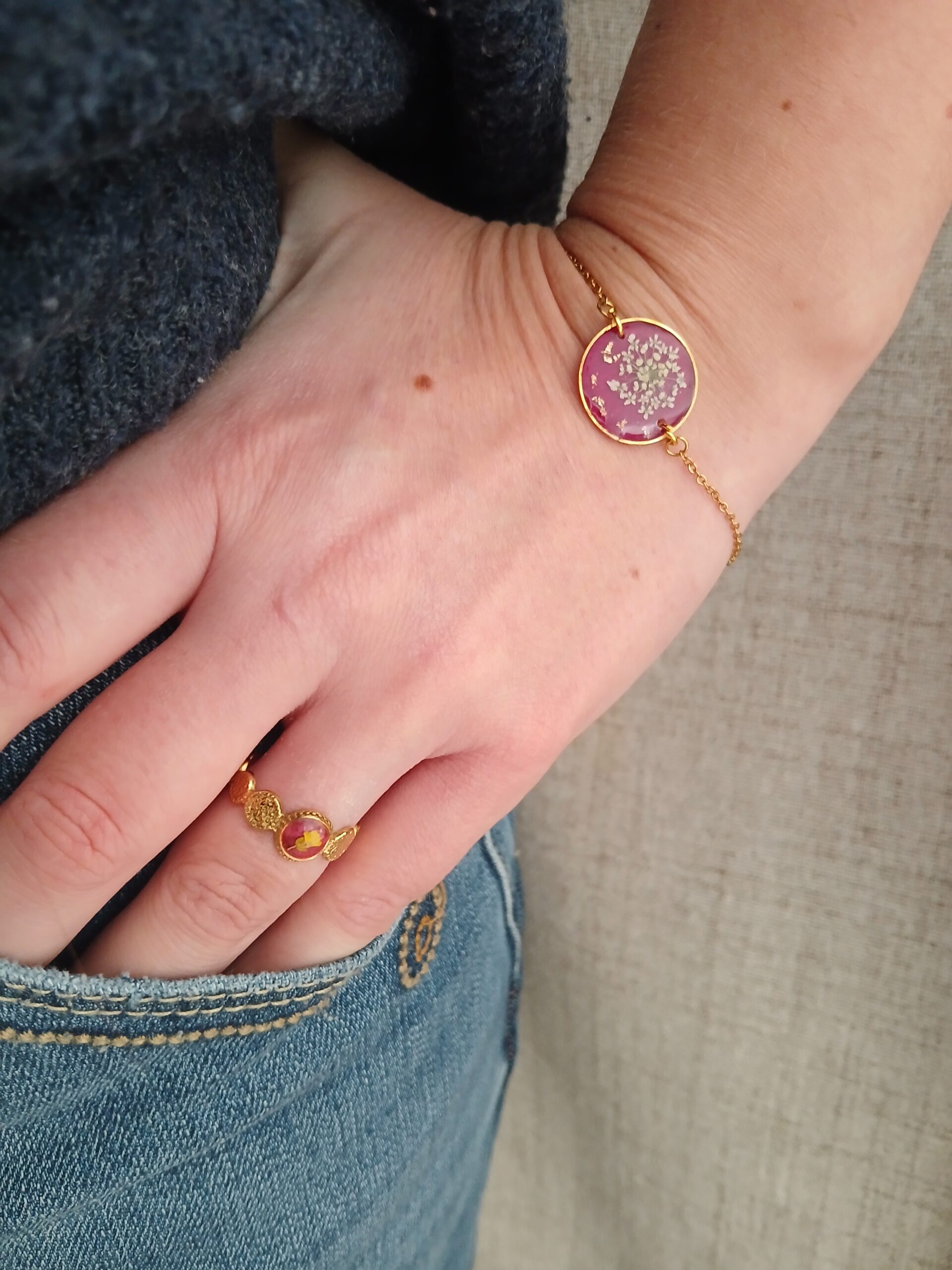 Chaque bracelet raconte une histoire florale : sureau, gypsophile, bruyère ou autres mini fleurs soigneusement intégrées pour un rendu naturel et raffiné.