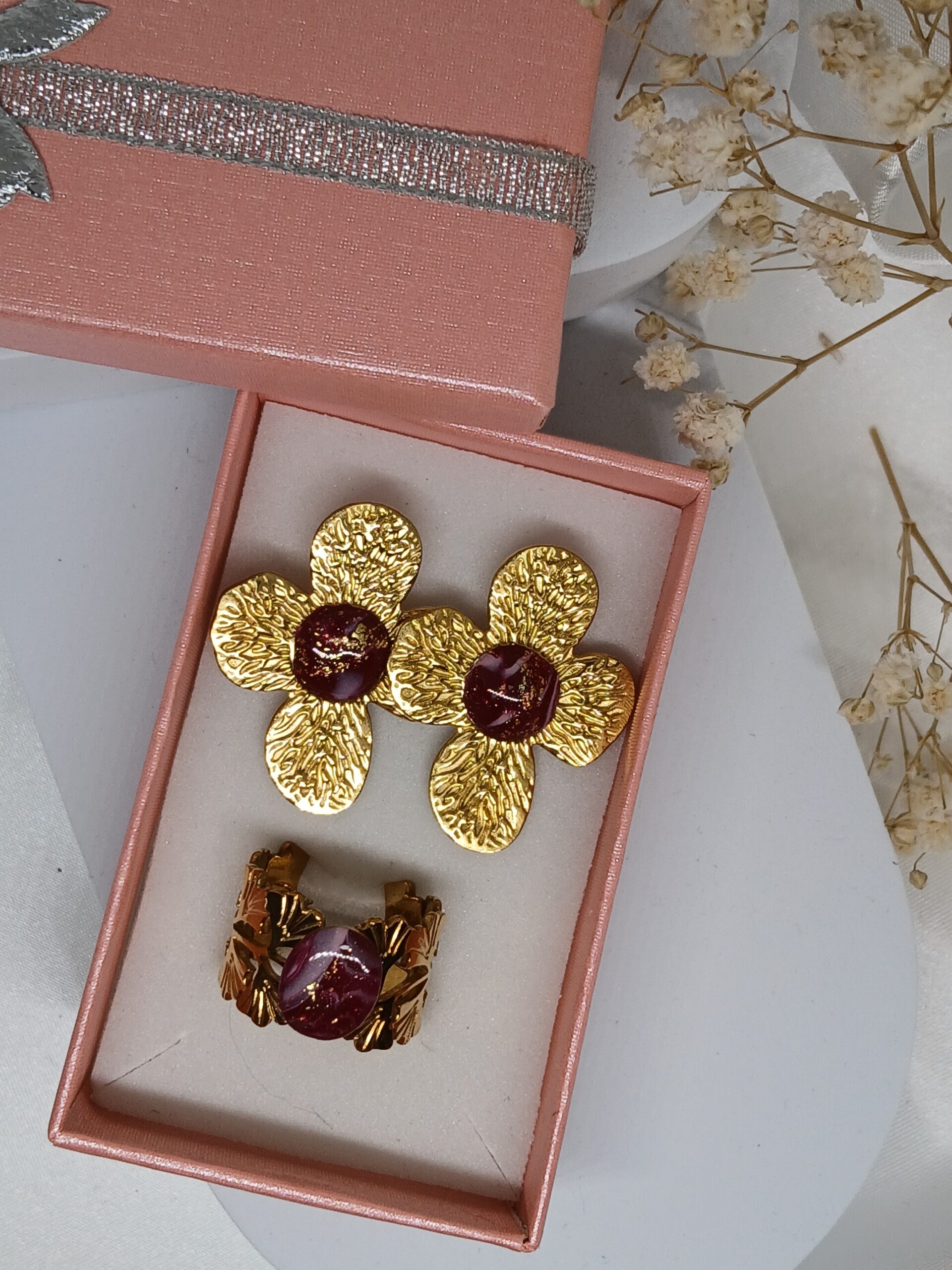 Coffret bijou femme boucles d’oreilles clou fleurs XL et bague en pâte polymère