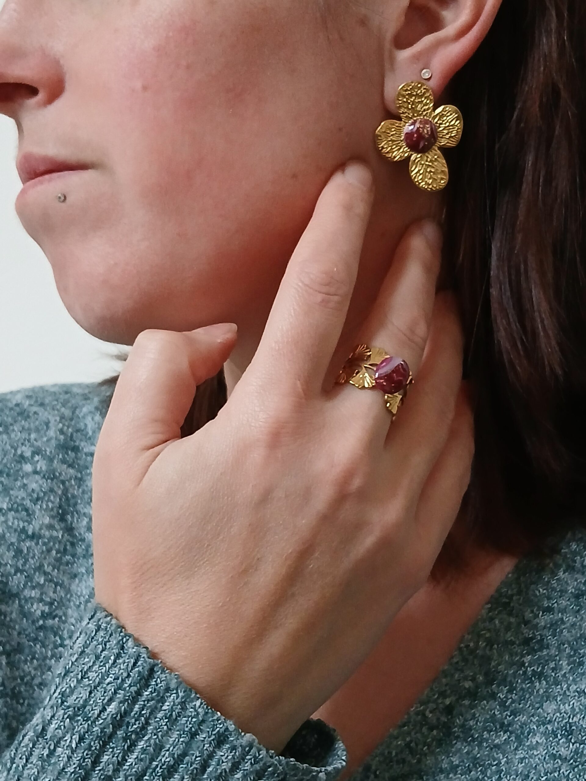 Coffret bague + boucles d’oreilles clous fleur 4 pétales /violet
