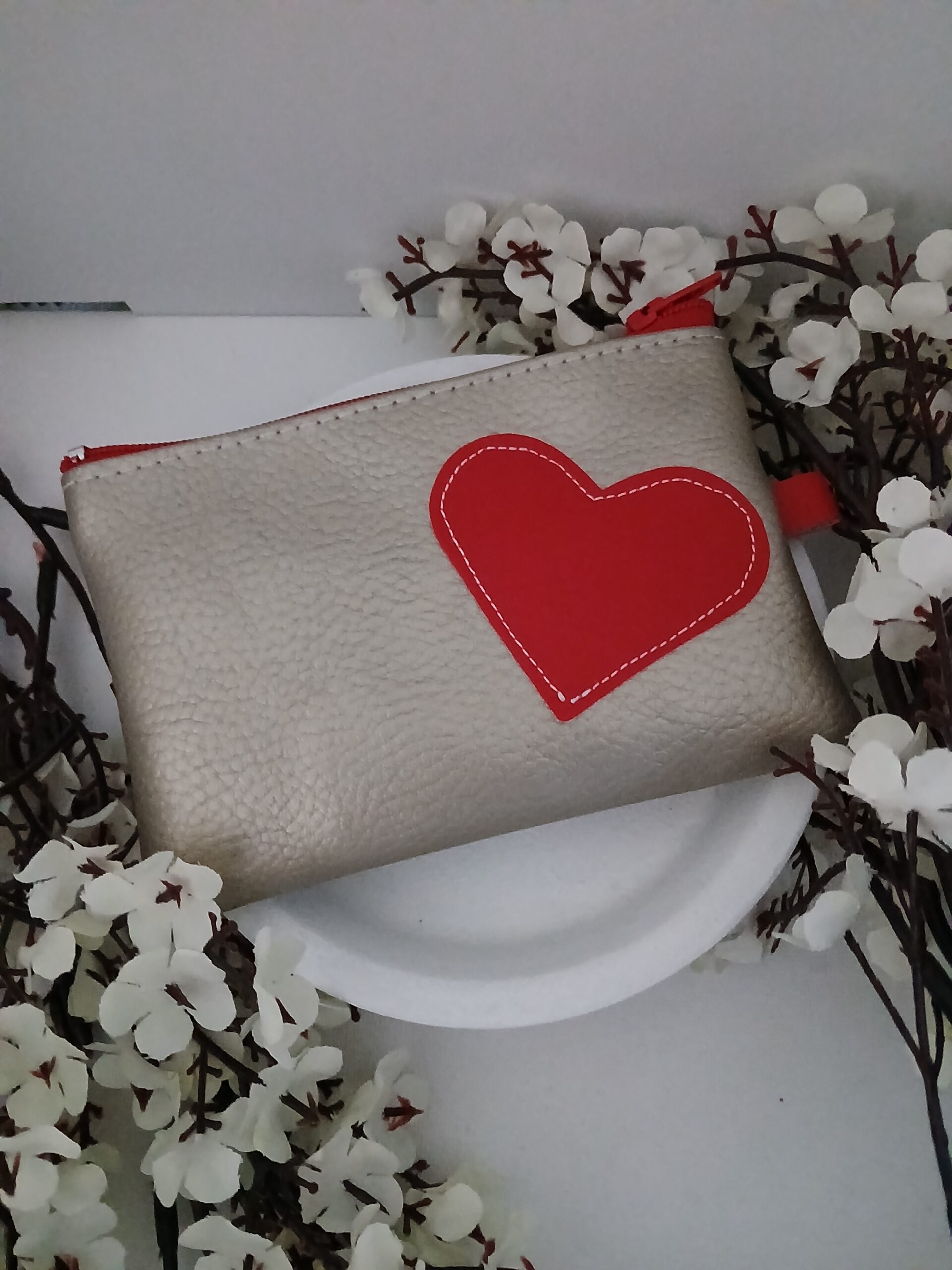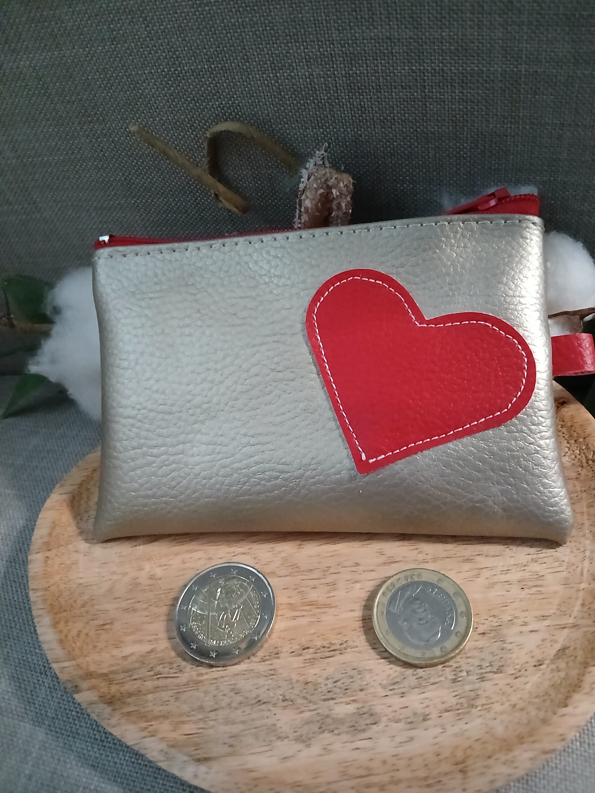 Porte-monnaie similicuir doré et coeur rouge, fermeture rouge